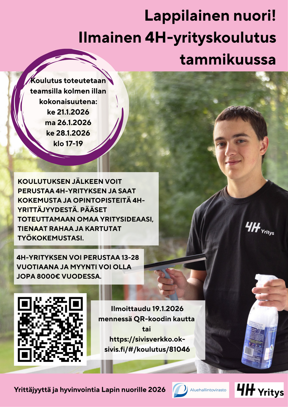 Ilmoittaudu 4H-yrityskurssille sivisverkon kautta tai QR-koodin kautta.