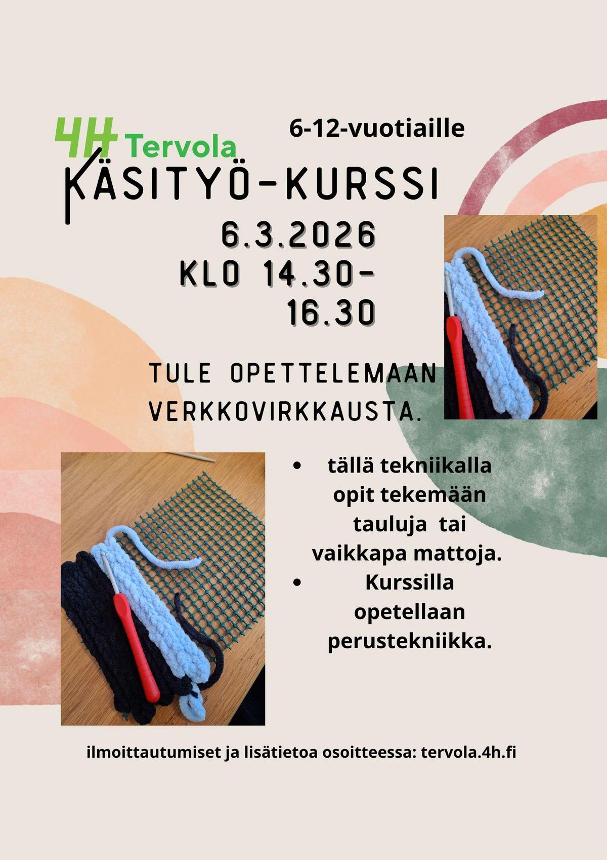 Tule kurssille opettelemaan uudenlainen virkkaustekniikka. Tämän avulla voit tehdä vaikka nukkekodin tekstiilejä, tauluja tai vaikka oikeita mattoja. Viimeinen ilmoittautumispäivä on 1.3.2026. Ilmoittautuminen on sitova. Kurssikirjeellä tulee maksutiedot kurssille.
